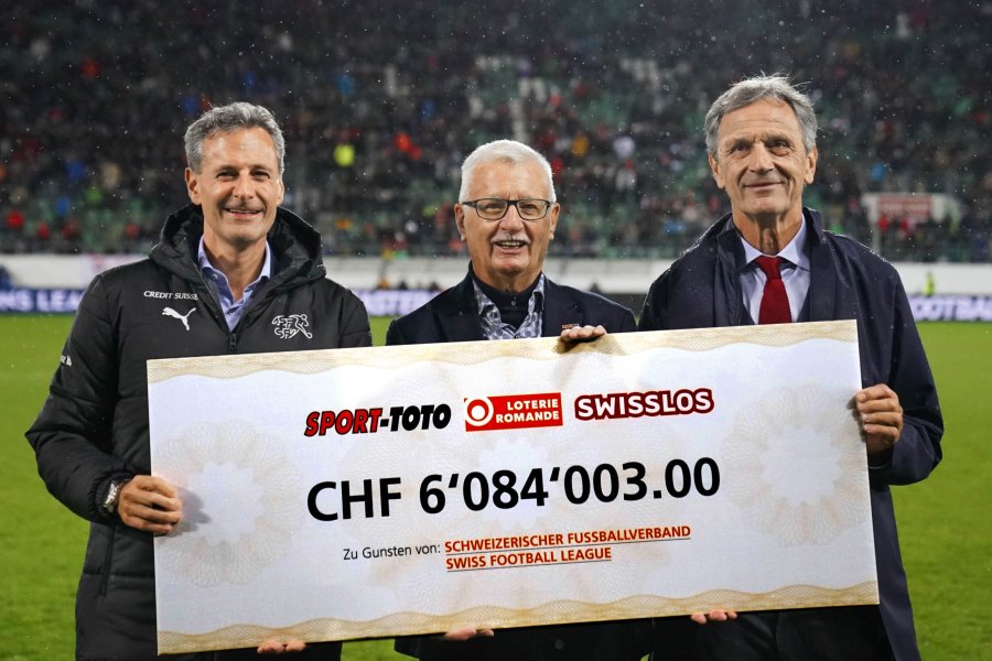 Auch im Jahr 2022 durften der SFV und die SFL Schweizer Lotteriegelder entgegennehmen. Anlässlich des Länderspiels der UEFA Nations League zwischen der Schweiz und der Tschechischen Republik in St. Gallen übergab Bernhard Koch, Präsident der Sport-Toto-Gesellschaft (STG), den symbolischen Check in der Rekordhöhe von 6’084’003 Franken an die beiden Präsidenten Dominique Blanc (SFV) und Philipp Studhalter (SFL).